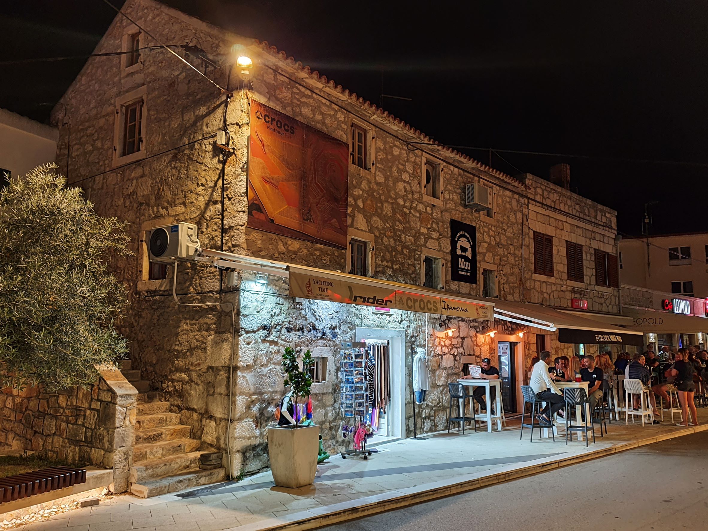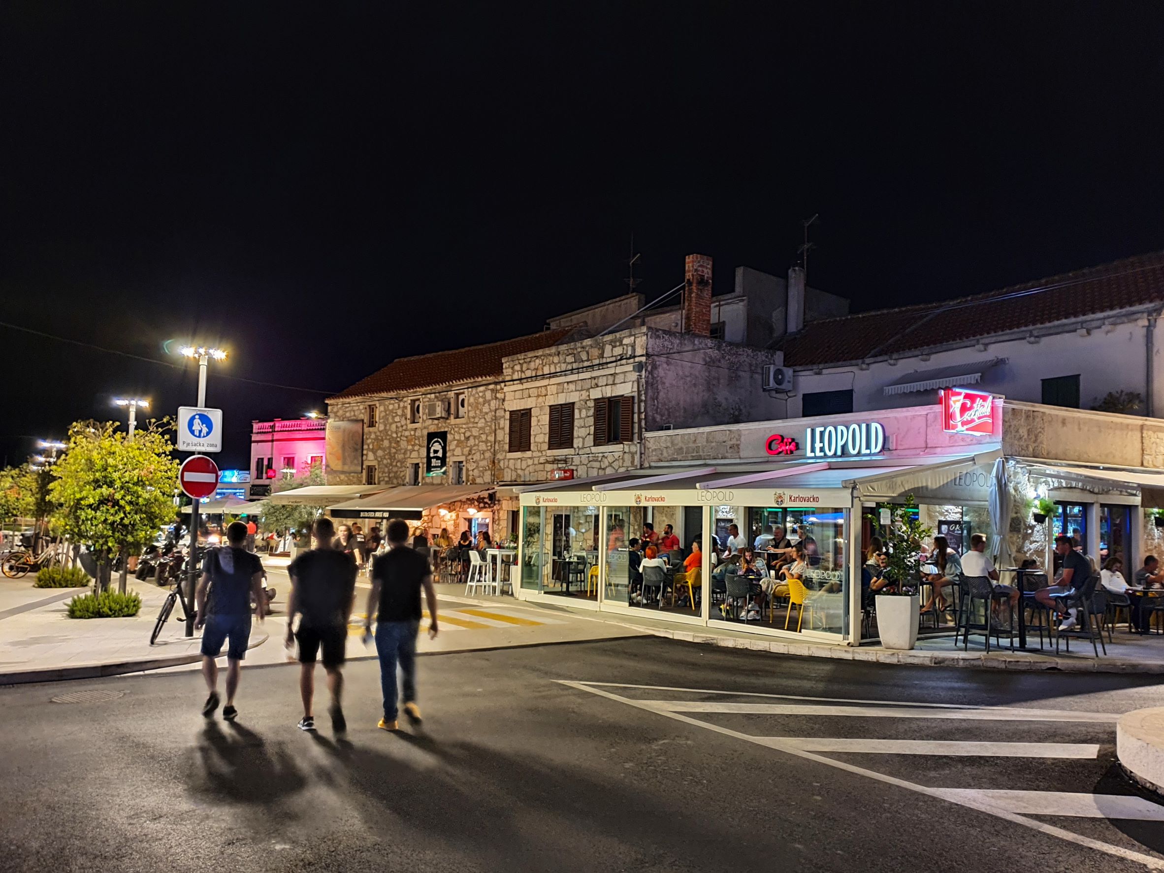 Bary, reštaurácie, kaviarničky, áno aj diskotéka, vysvietený prístav... tu to žije. Vraciame sa do reštaurácie, kde sme počas dňa stihli vypiť pivko a minerálku, aby sme si vychutnali niečo skvelé po zub. Popri tom tu na námestí v prístave hrá živá hudba, ľudia tancujú, jedia, pijú, tešia sa... Možno to znie ako klišé, ale tu v Chorvátsku má takýto večer atmosféru a dušu. To my na Slovensku nevieme, žiaľ.