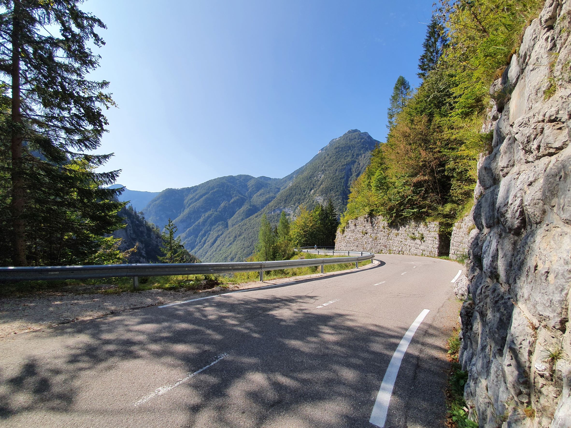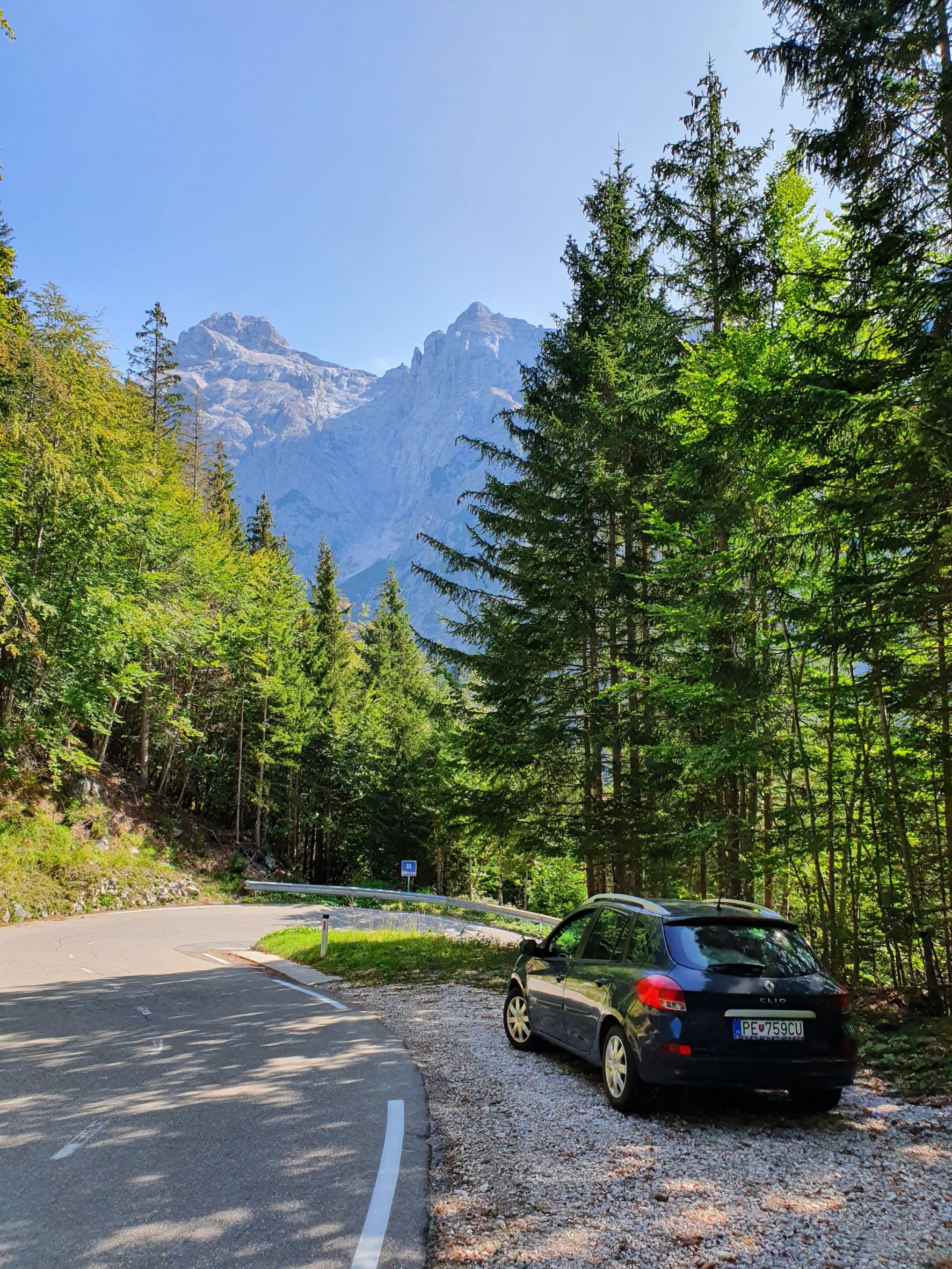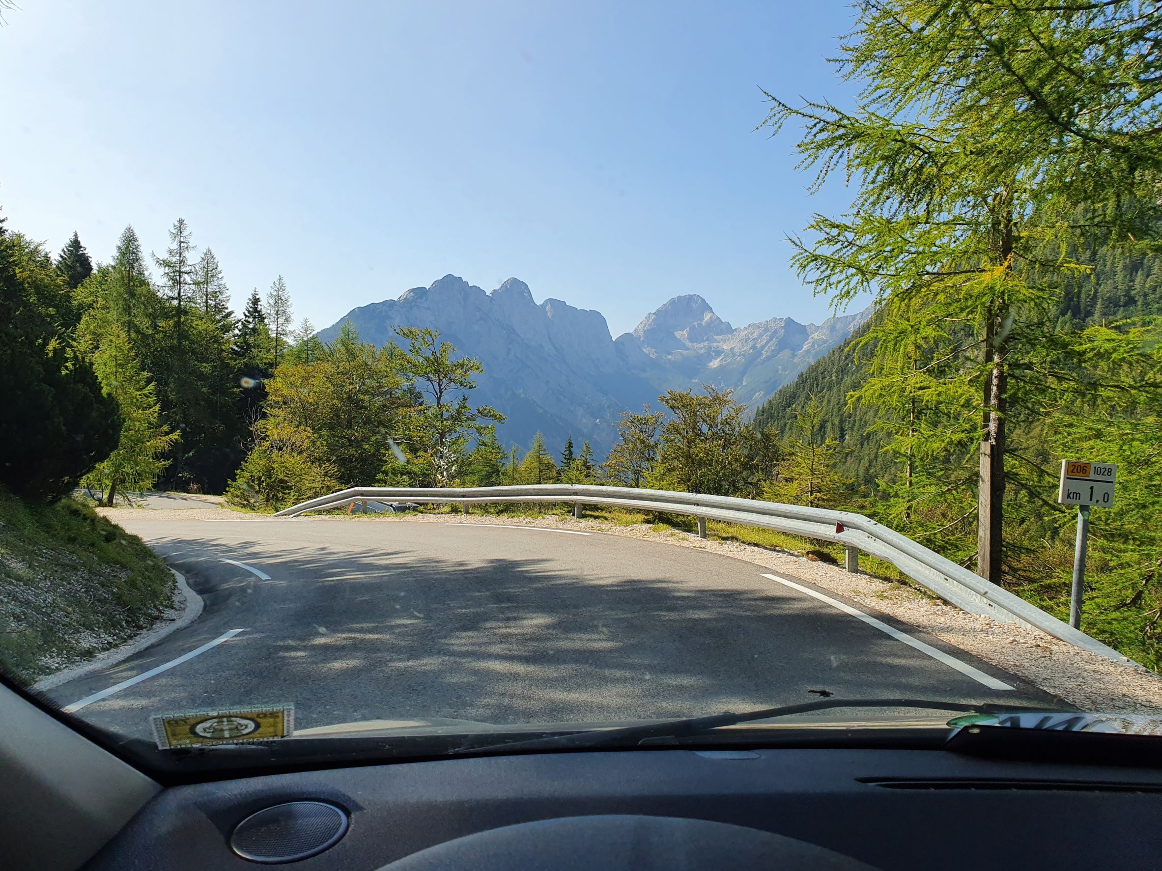 Ďalej, počas cesty hore si robíme pár zastávok, počas ktorých sa nám odkrýva neuveriteľná príroda a výhľady na krásu Triglavského národného parku a Júlskych Álp. Po zhruba 25 mierne adrenalínových kilometroch od Kranjskej Gory sa nachádzame v najvyššom bode cesty, v priesmyku Vršič. Je to pravdepodobne miesto s najväčším počtom ľudí na centimeter štvorcový v Slovinsku a ak nie ľudí, tak minimálne áut. Parkovisko je samozrejme plné áut a karavanov, kanál na okraji cesty obsadili malé autá, ktoré sa sem dokázali vyštverať, na obrovských kameňoch sa podarilo zaparkovať offroadom a zvyšné miestečka obsadili motorky. A tie najmenšie miesta bicykle. Naše malé kombi do tohto konceptu parkovania akosi nezapadá a tak pokračujeme ďalej. Ale nezúfame, pretože náš cieľ nebol samotný priesmyk Vršič, ale najmä prejazd touto nádhernou horskou cestou. Z priesmyku teda klesáme do úchvatného údolia rieky Soča až k mestu Bovec, kde Road 206 končí.