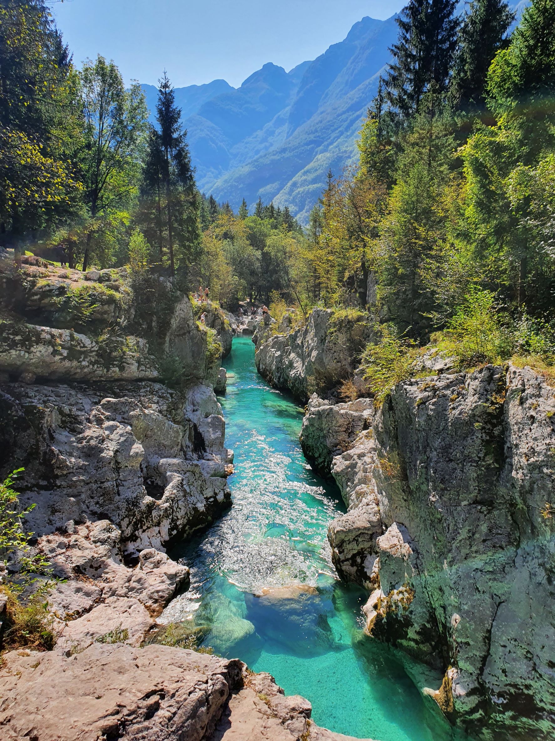 Počas klesania k dedine Trenta sa nachádza pár zastávok s výhľadmi na vrchy Travnik a Jalovec, za ktorými sa už nachádza Taliansko. Medzi Trentou a Bovcom nám robí príjemnú spoločnosť rieka Soča. Soča je vďaka svojej neuveriteľne modrej a priezračnej farbe jednou z najkrajších horských riek, aké sme kedy videli. Ak radi splavujete rieky a zbožňujete raftovanie, toto je jedno z najkrajších miest, aké v Európe nájdete!