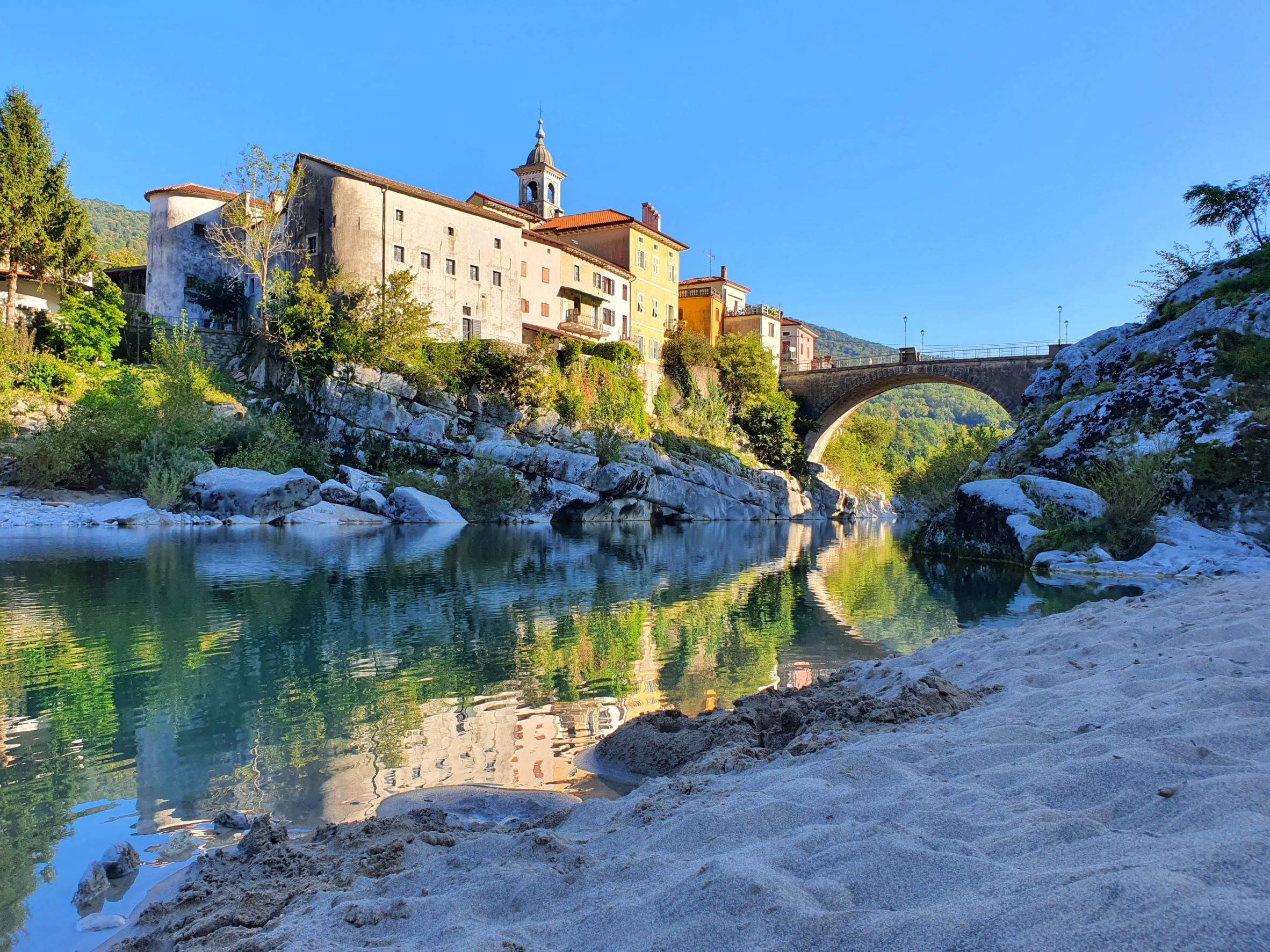 Dedinou preteká rieka Soča a panoráma z brehov rieky nám mimoriadne pripomína nádherné mesto Mostar ležiace v Bosne a Hercegovine. Len tých mešít je tu v porovnaní s Mostarom oveľa menej, konkrétne žiadna. V centre dediny sa nachádza kostolík zo 14. storočia a za ním krčma, kde čapujú Staroprameň, takže našincovi sa tu rozhodne bude páčiť. Mimochodom, do centra dediny sa vchádza cez most, na ktorom sa často konajú rôzne súťaže v skoku do rieky Soča. Žeby to obkukali práve v Mostare?